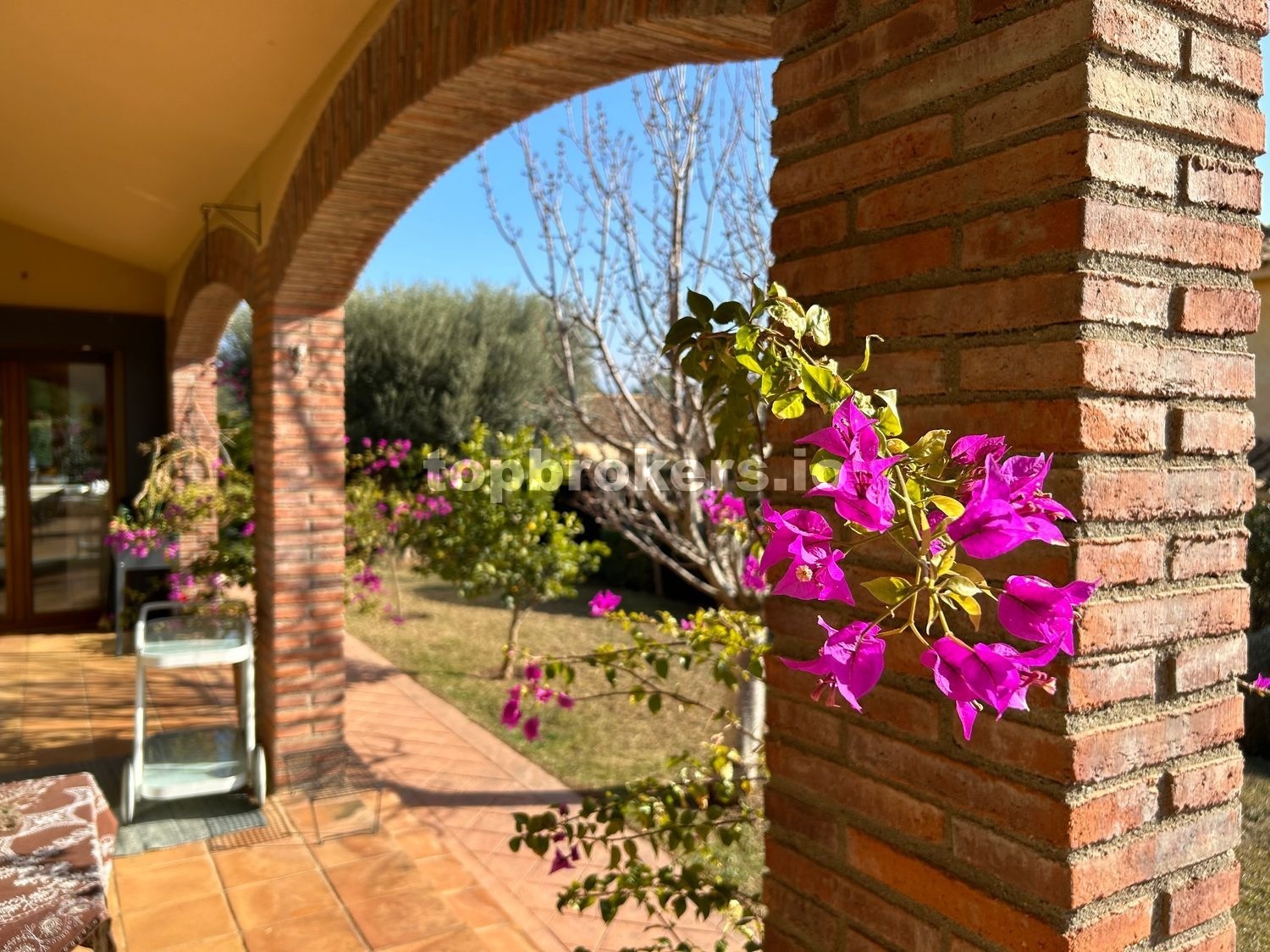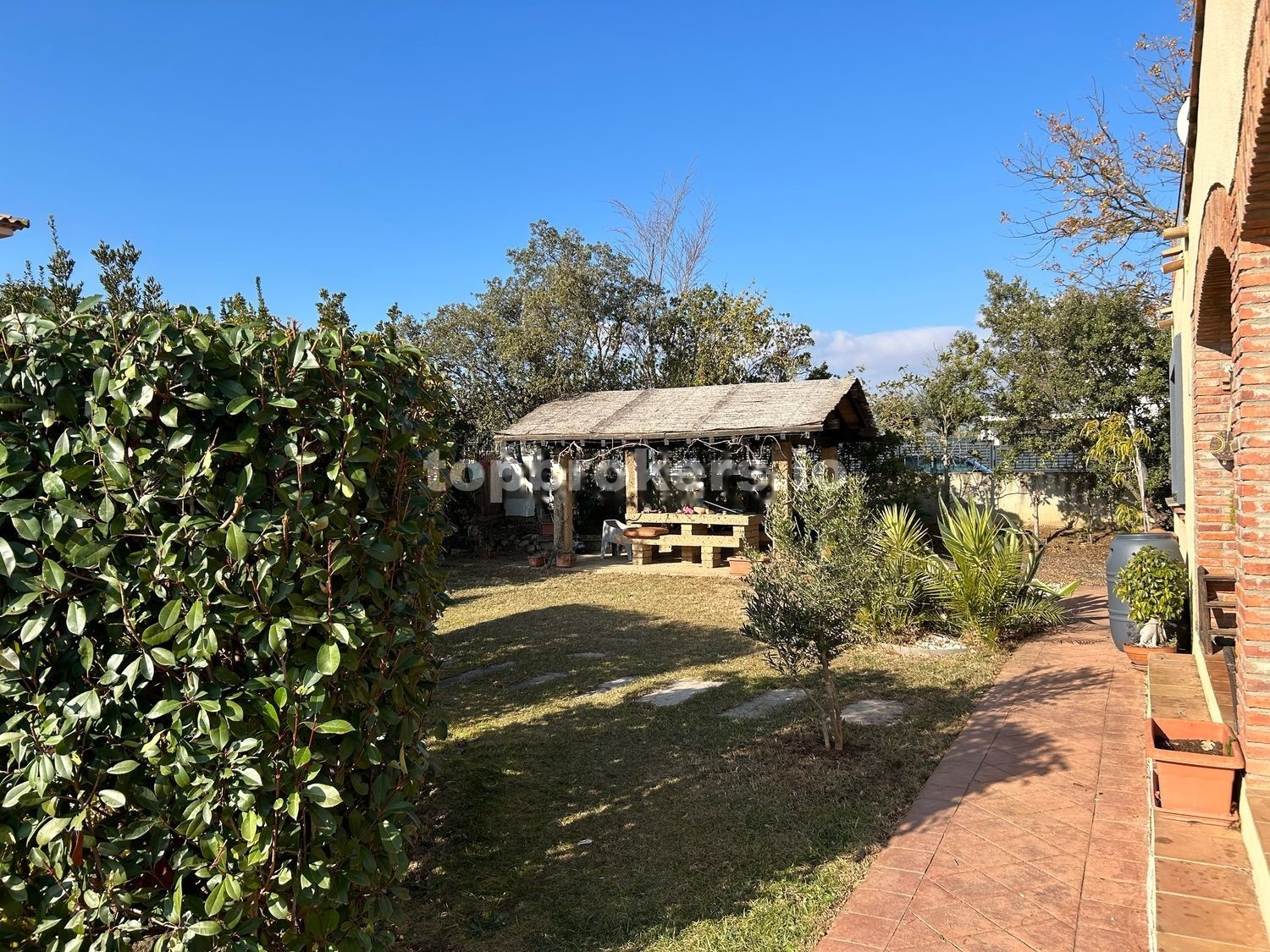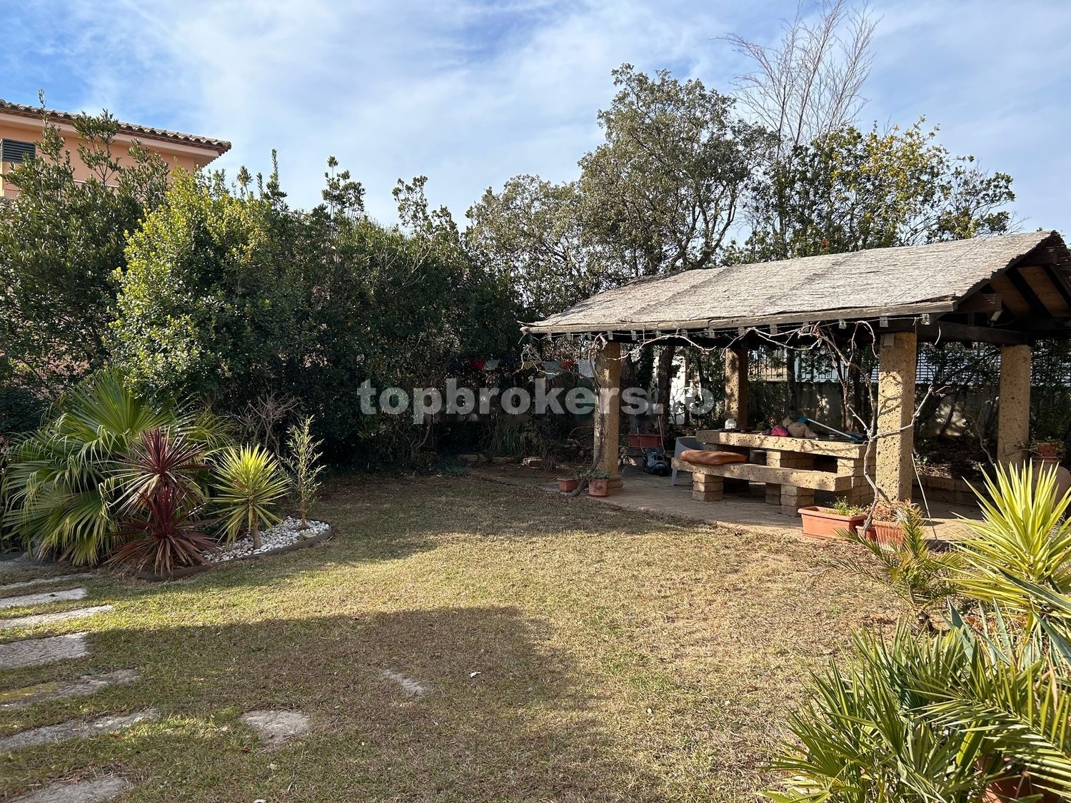 El jardín de 1200 metros tiene muchas plantas decorativas y árboles, una piscina reformada y un gazebo con mesa de piedra.