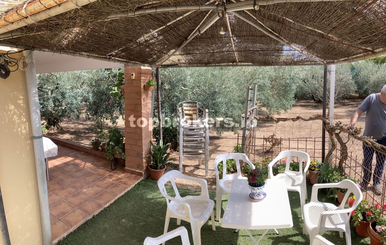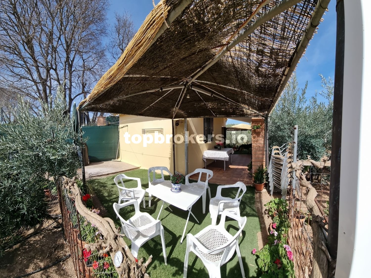 -Terraza porchada de 13m2 con 2 mesas, sillas de plástico y sillas de madera y acero inoxidable. Césped artificial alrededor de la vivienda y 2 pérgolas de 8m2