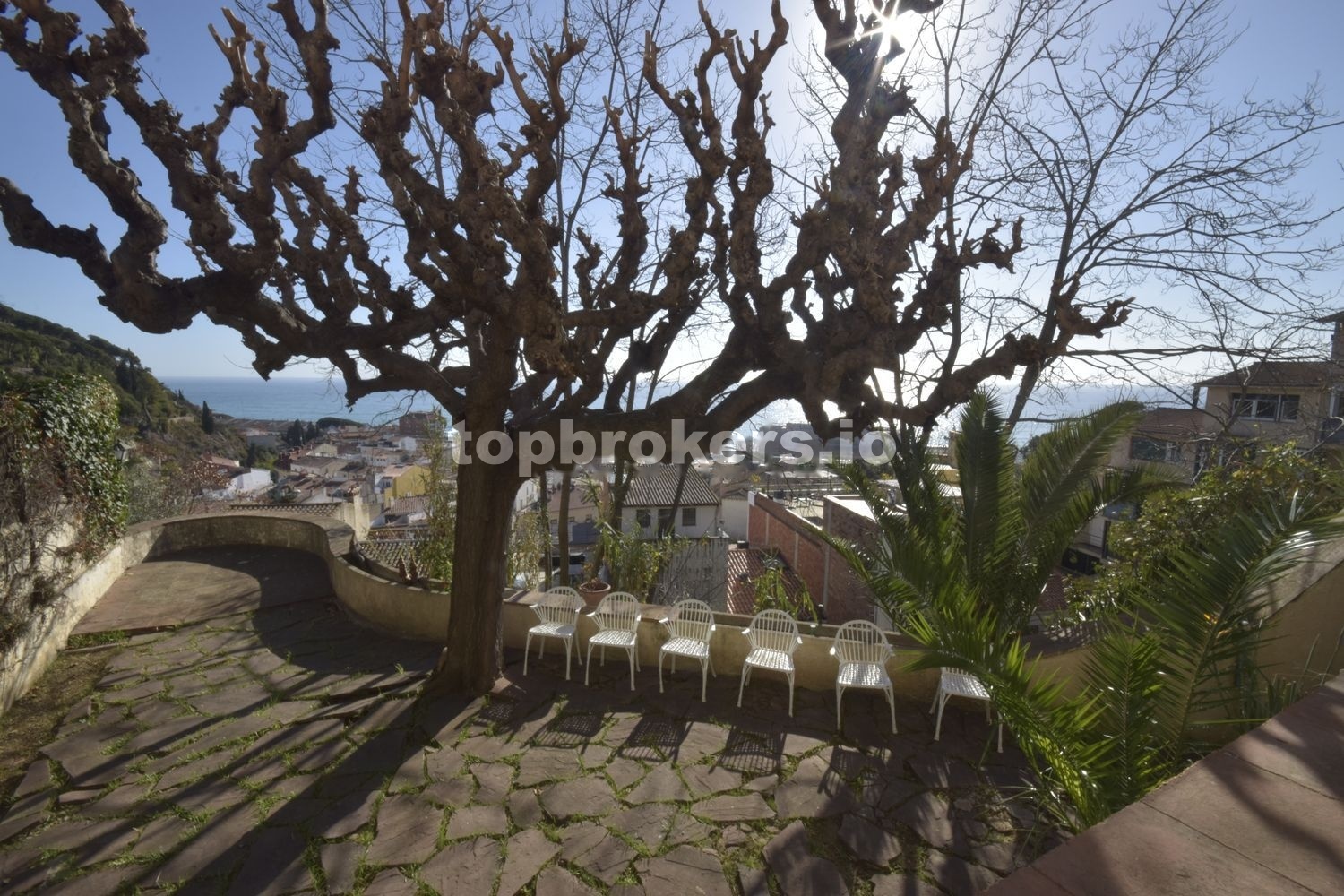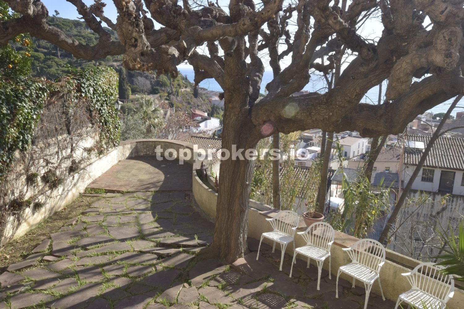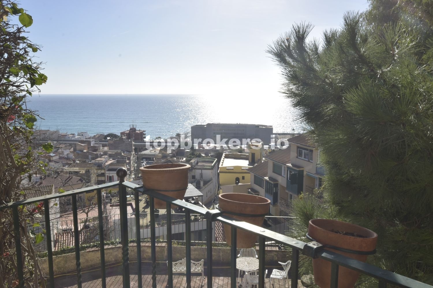 Magnifica vista del pueblo, la playa y el mar. El espacio de la casa disfruta de la sombra de un par de pinos, un pimentero rosa, y una palmera, además de dos grandes moreras, entre otras plantas.