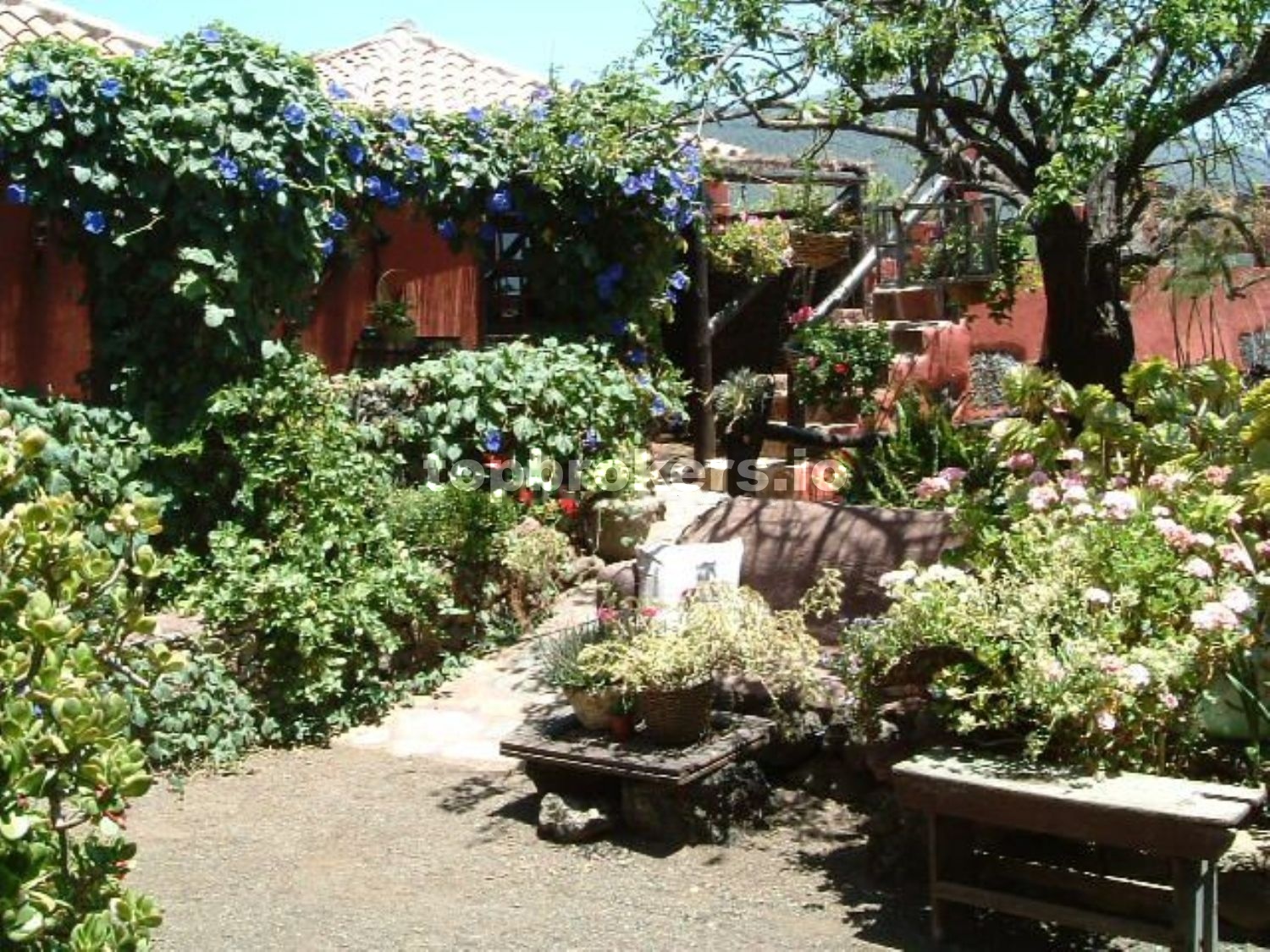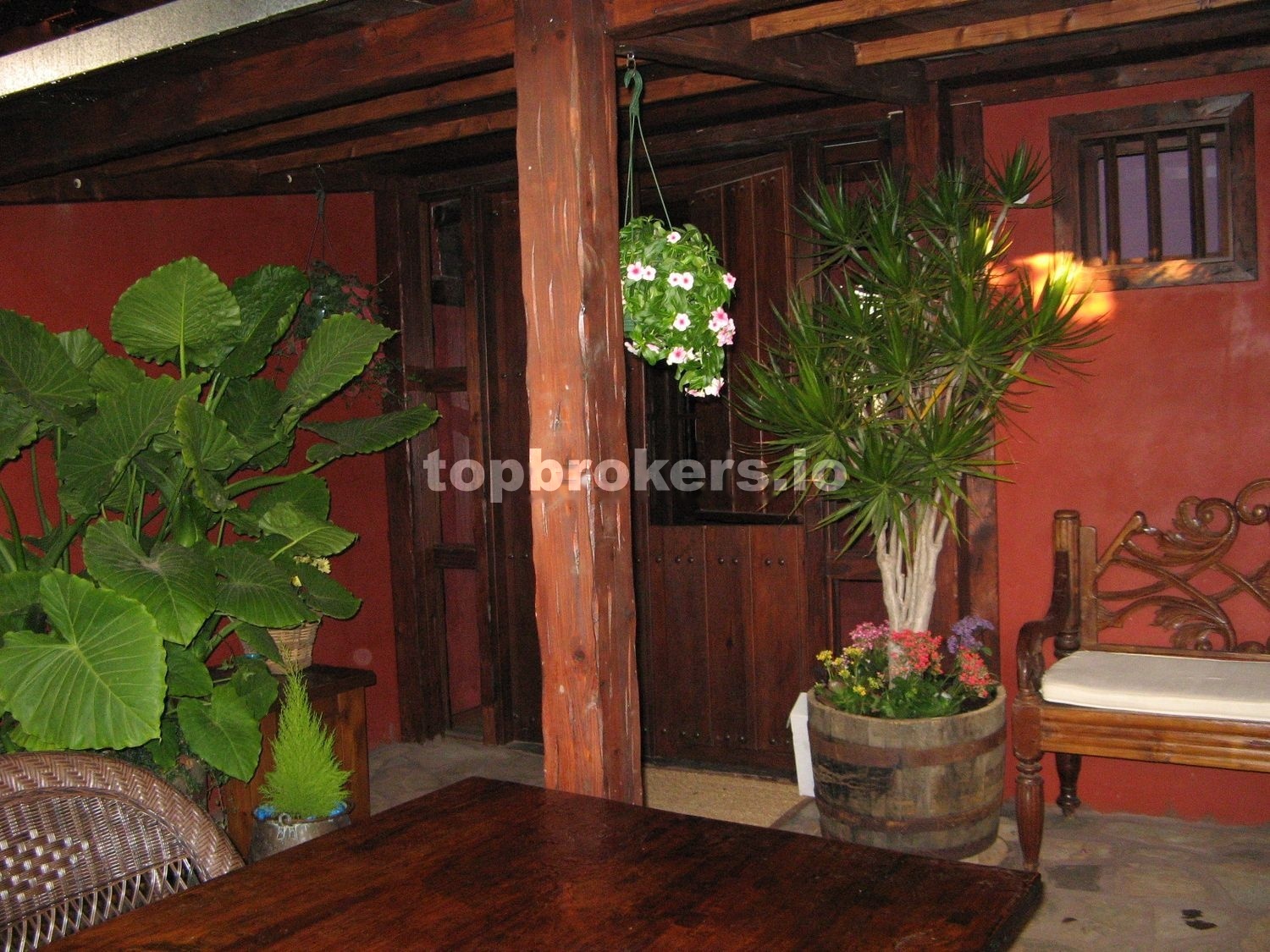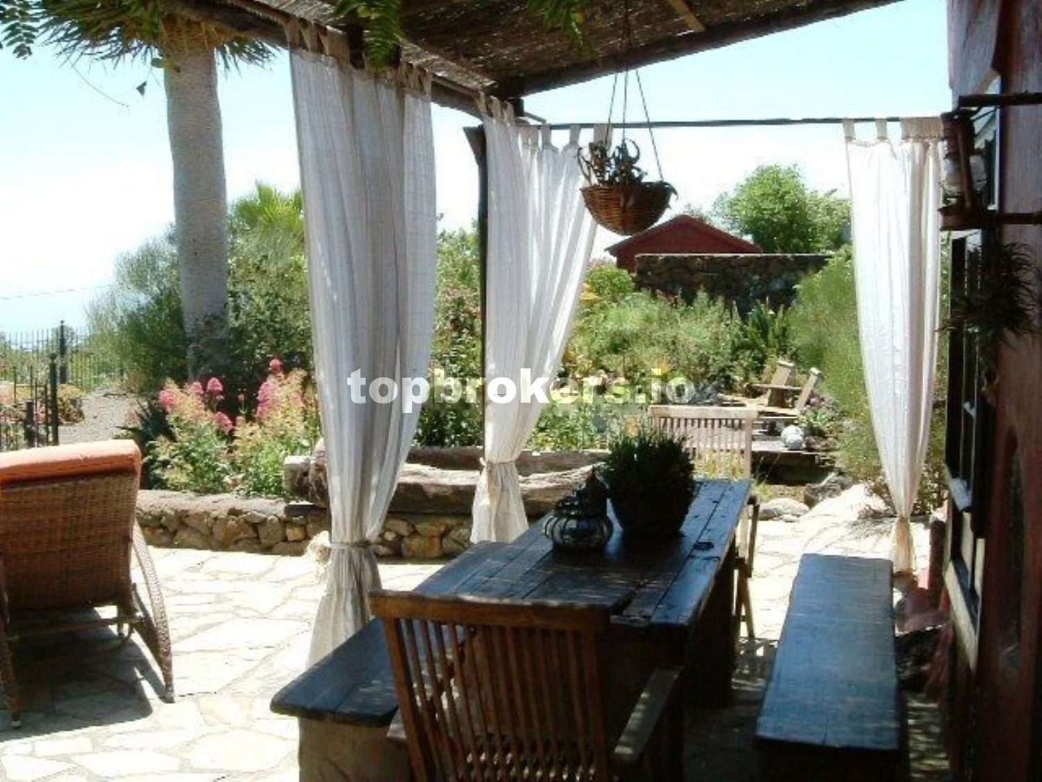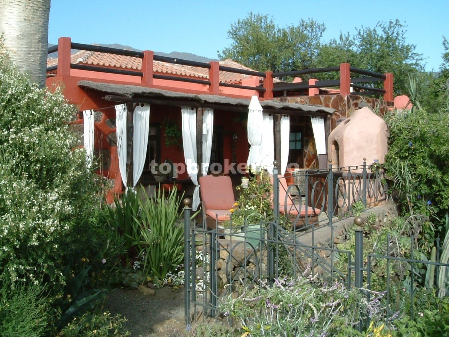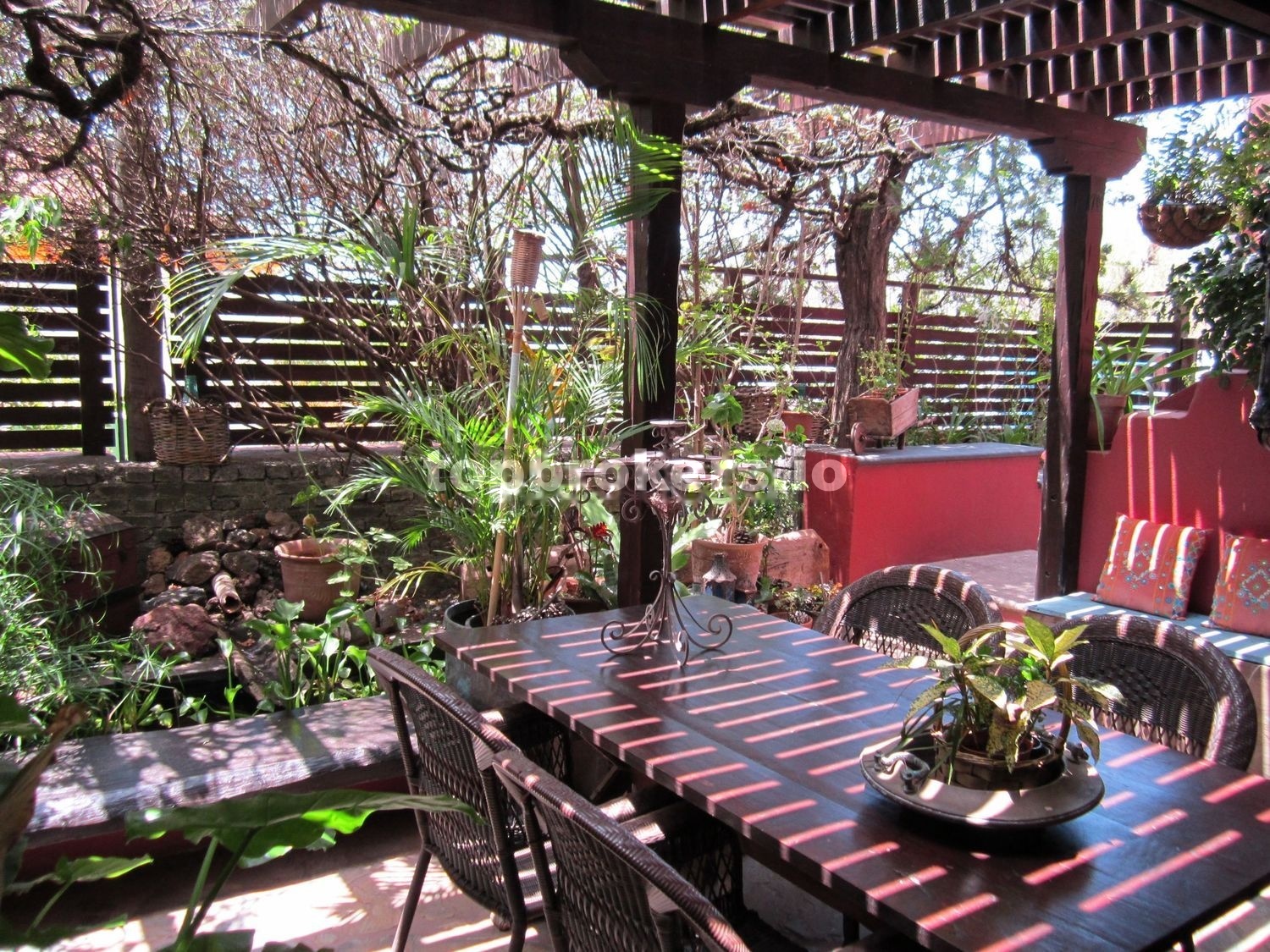 A la casa principal se accede a través de una patio,terraza techada y bien protegida de miradas curiosas, con una pequeña charca con peces, con muchos rinconcitos donde sentarse y disfrutar del entorno rodeado de muchas plantas.