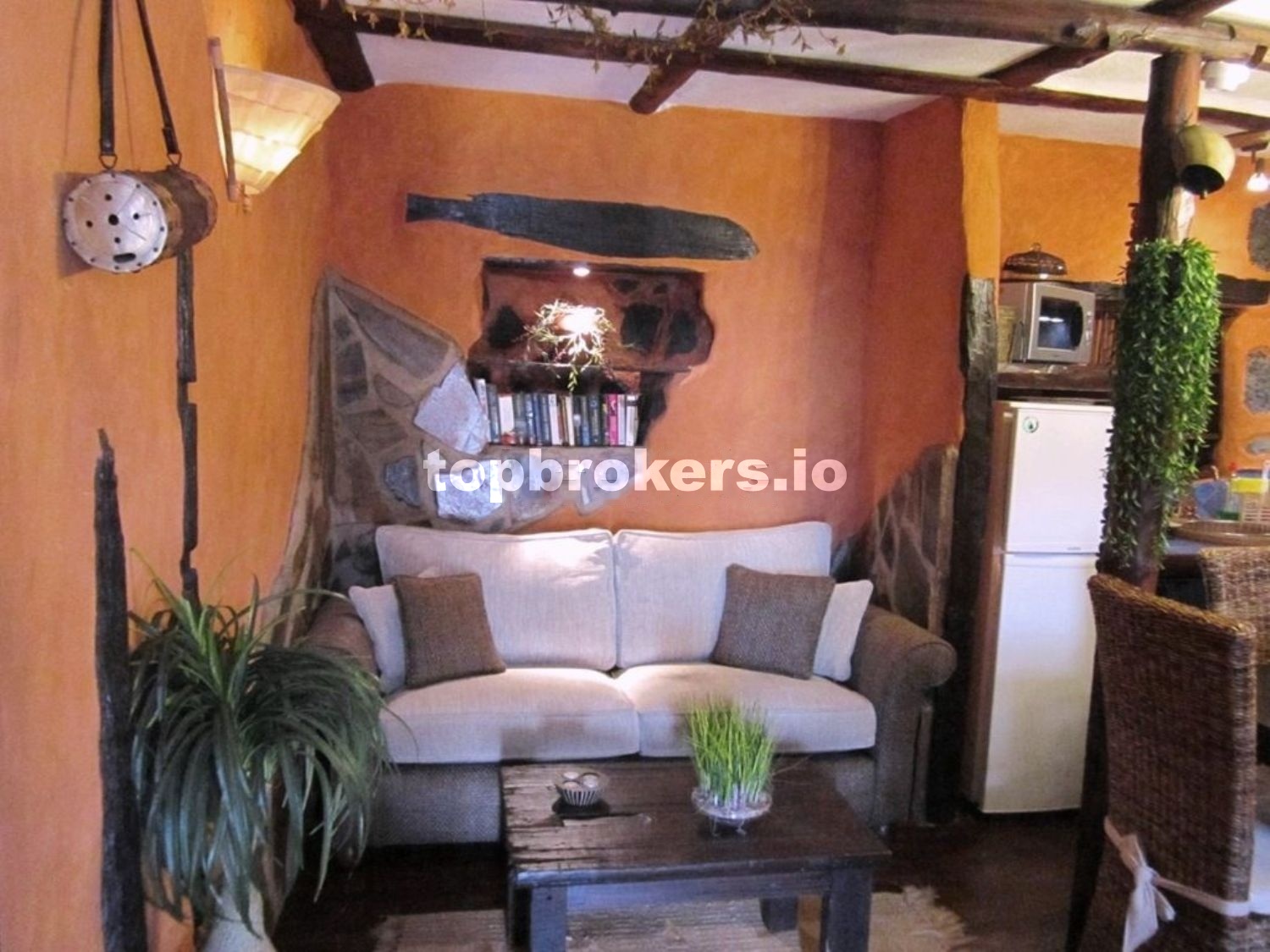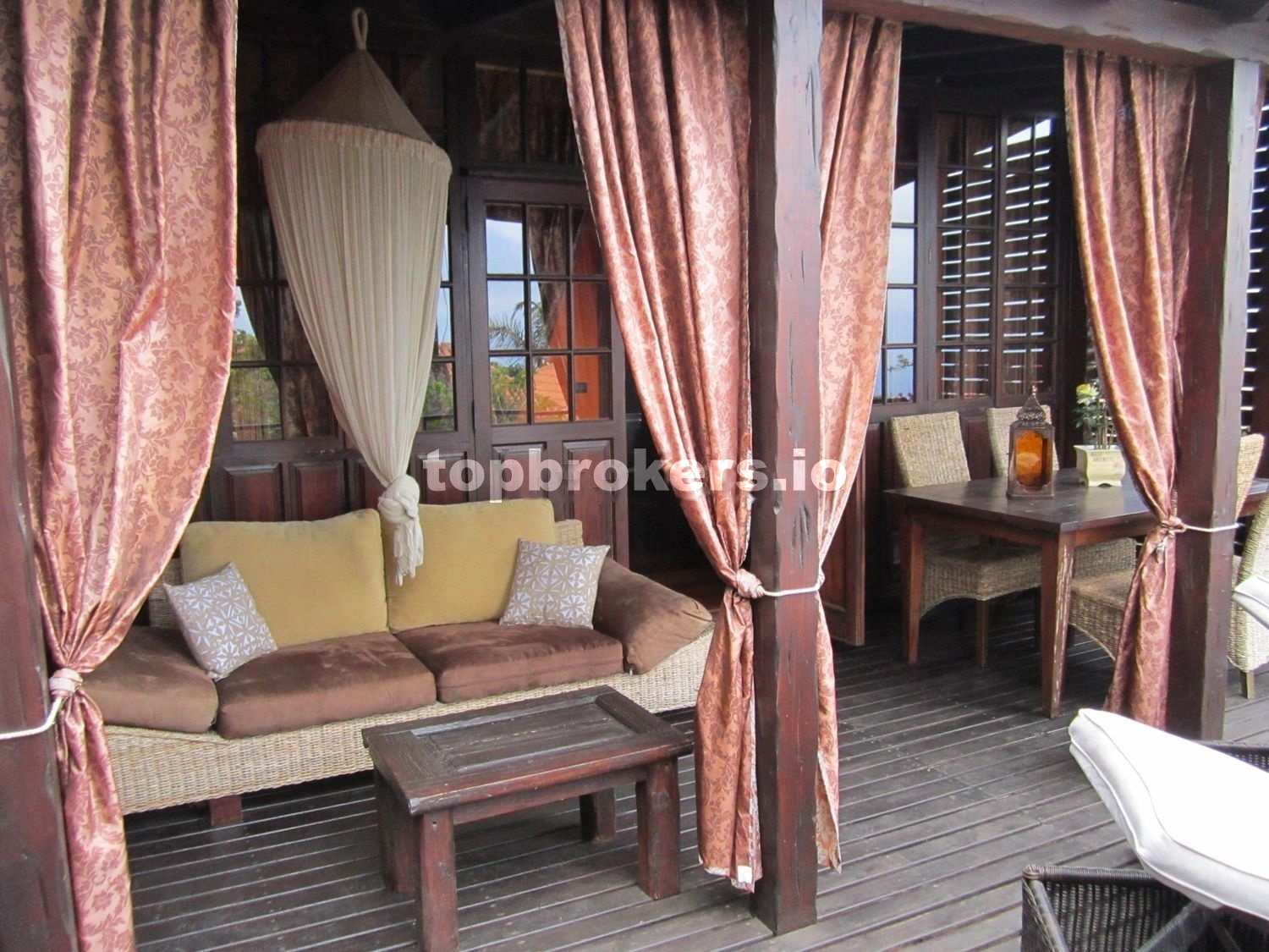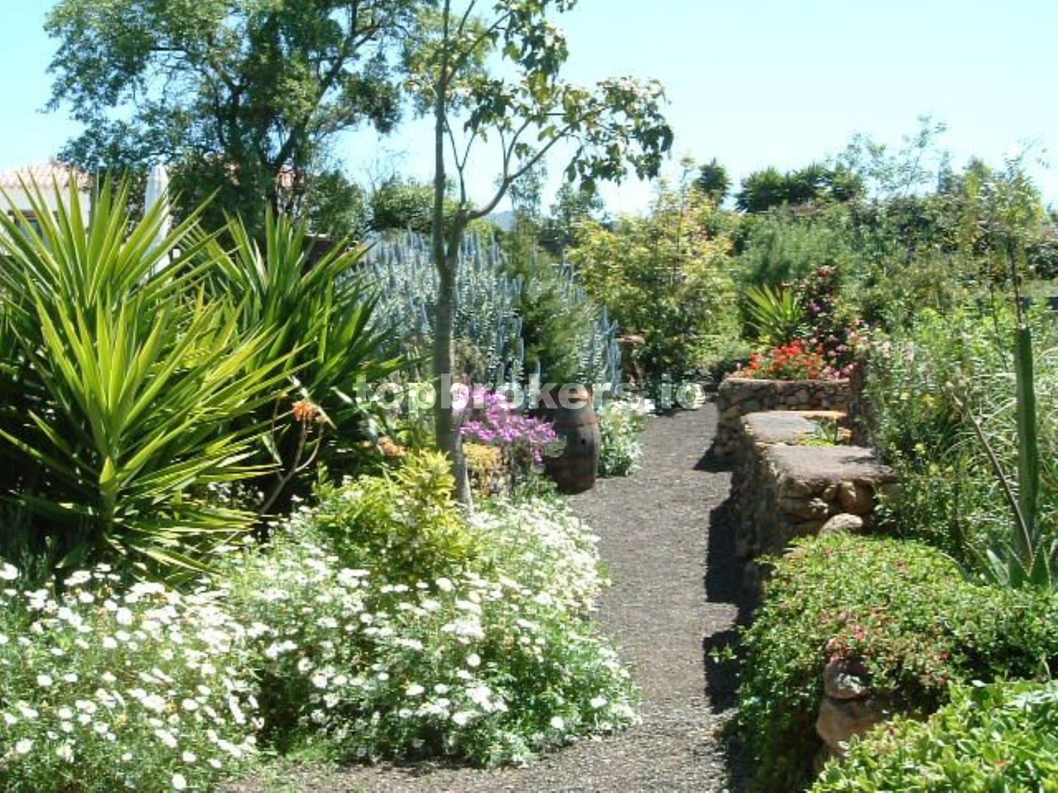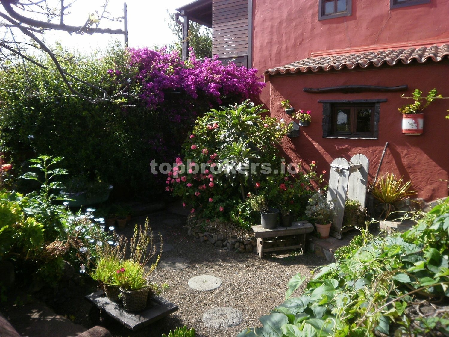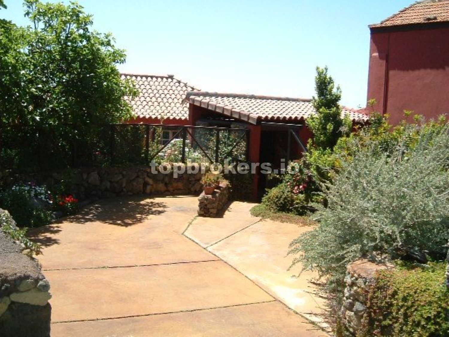 A la casa principal se accede a través de una patio,terraza techada y bien protegida de miradas curiosas, con una pequeña charca con peces, con muchos rinconcitos donde sentarse y disfrutar del entorno rodeado de muchas plantas.