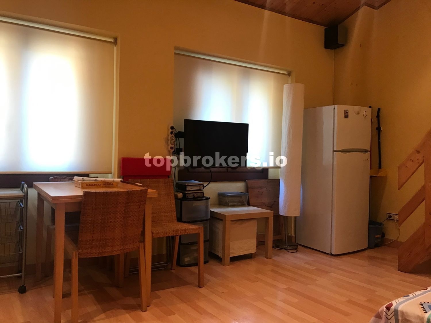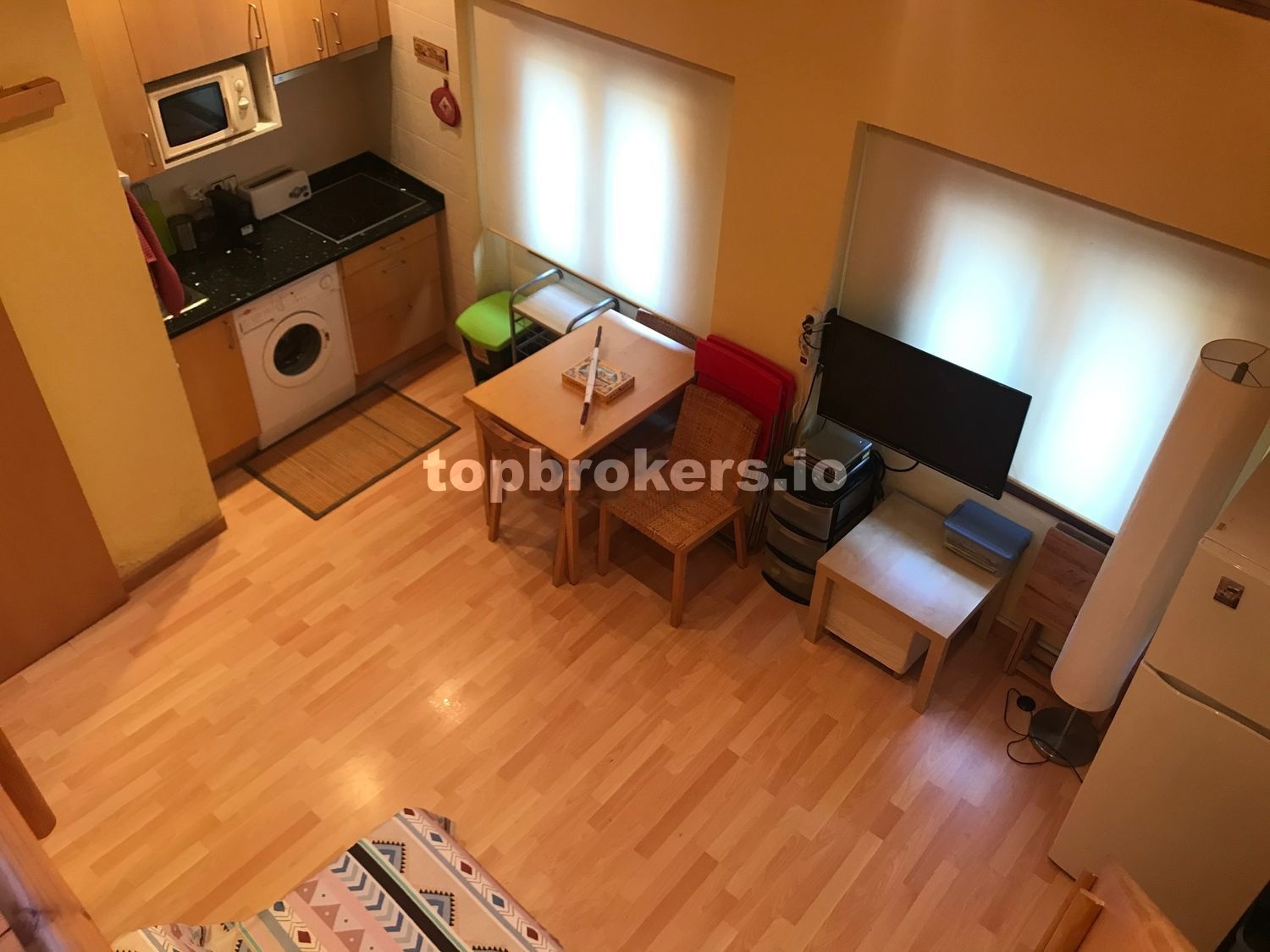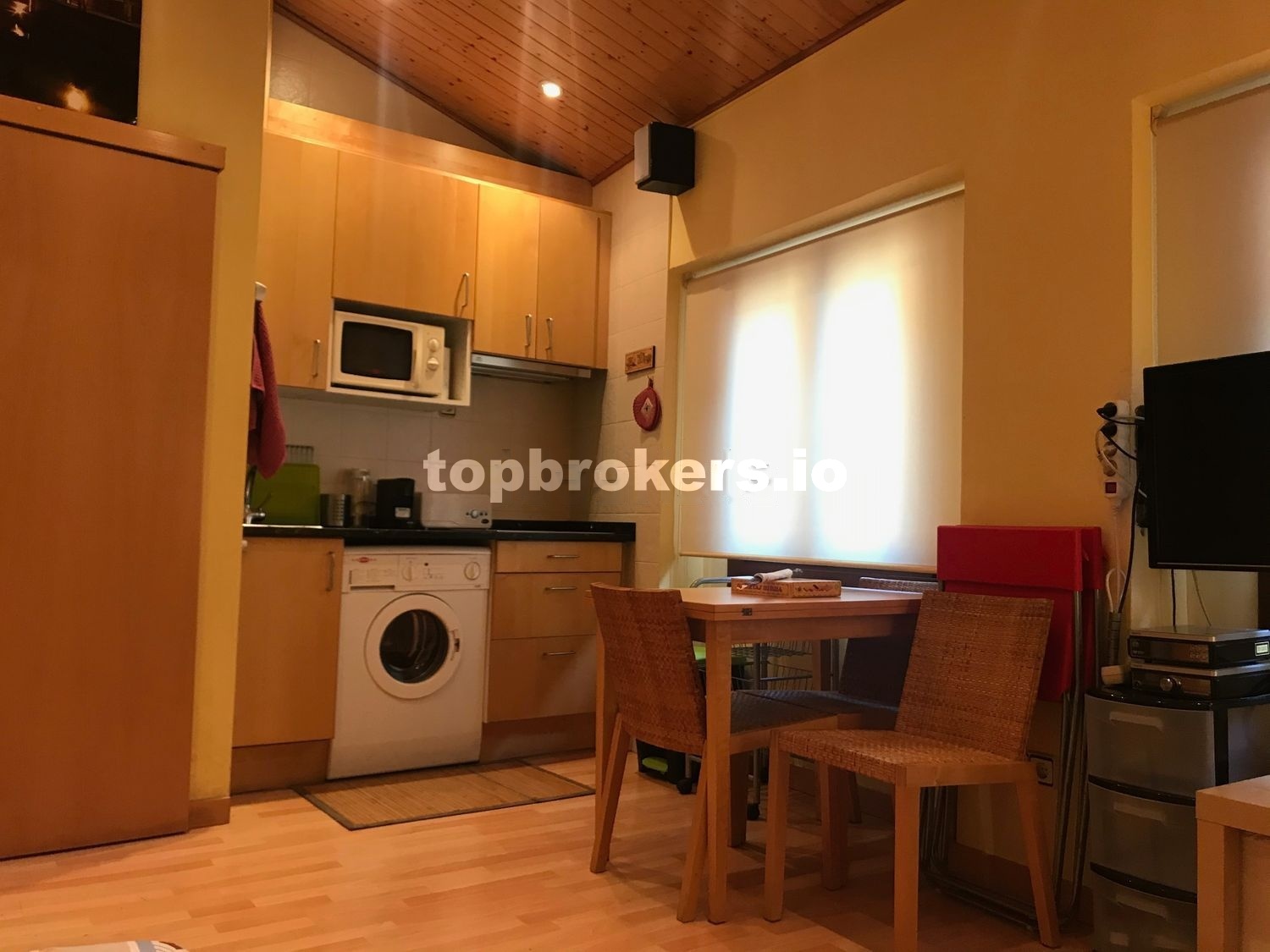 Como podréis ver en las fotos, la distribución del apartamento es la siguiente: tiene una sala / comedor / cocina, con todo lo necesario: Un sofá-cama, ( es cama individual, no se abre ), una mesa extensible, 8 sillas ( 4 de madera y mimbre y otras 4 plegables ), dos mesitas pequeñas, TV de 32’’, nevera, microondas y lavadora.
