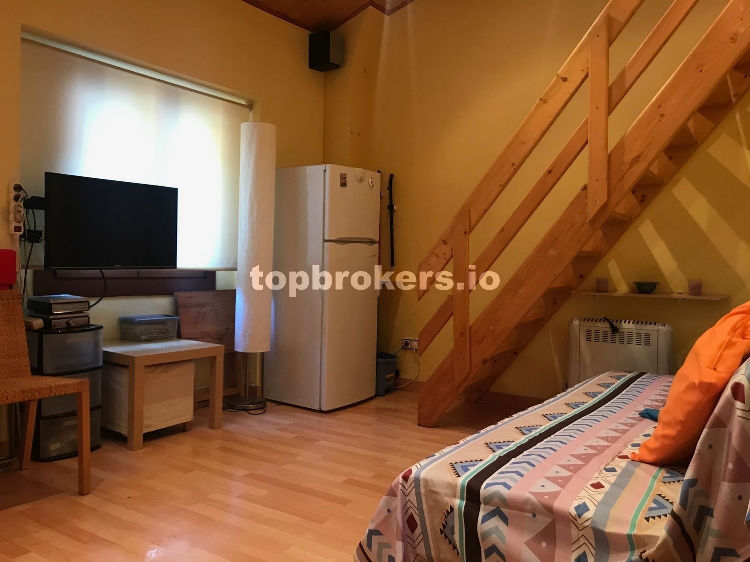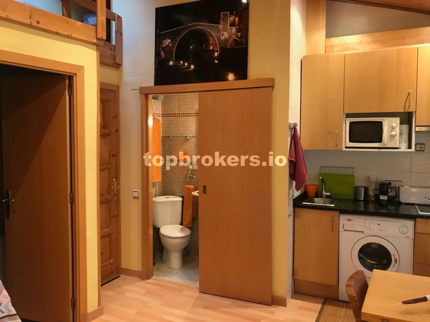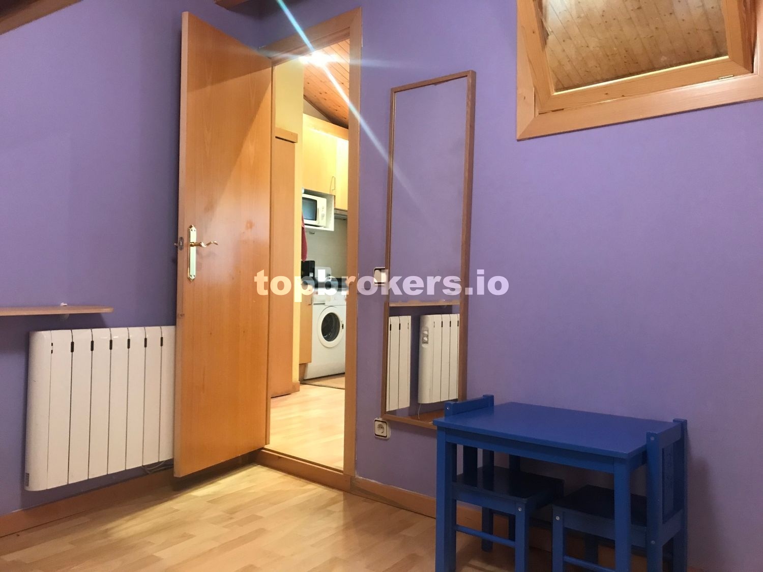 Como podréis ver en las fotos, la distribución del apartamento es la siguiente: tiene una sala / comedor / cocina, con todo lo necesario: Un sofá-cama, ( es cama individual, no se abre ), una mesa extensible, 8 sillas ( 4 de madera y mimbre y otras 4 plegables ), dos mesitas pequeñas, TV de 32’’, nevera, microondas y lavadora.