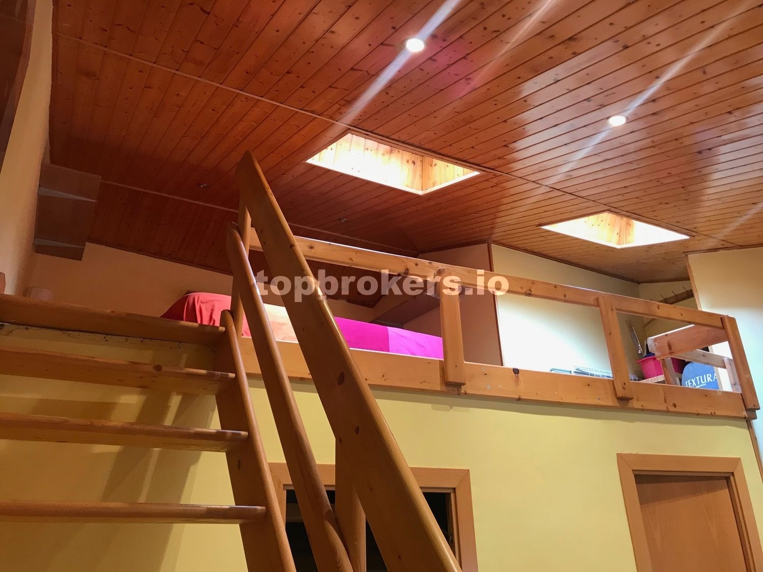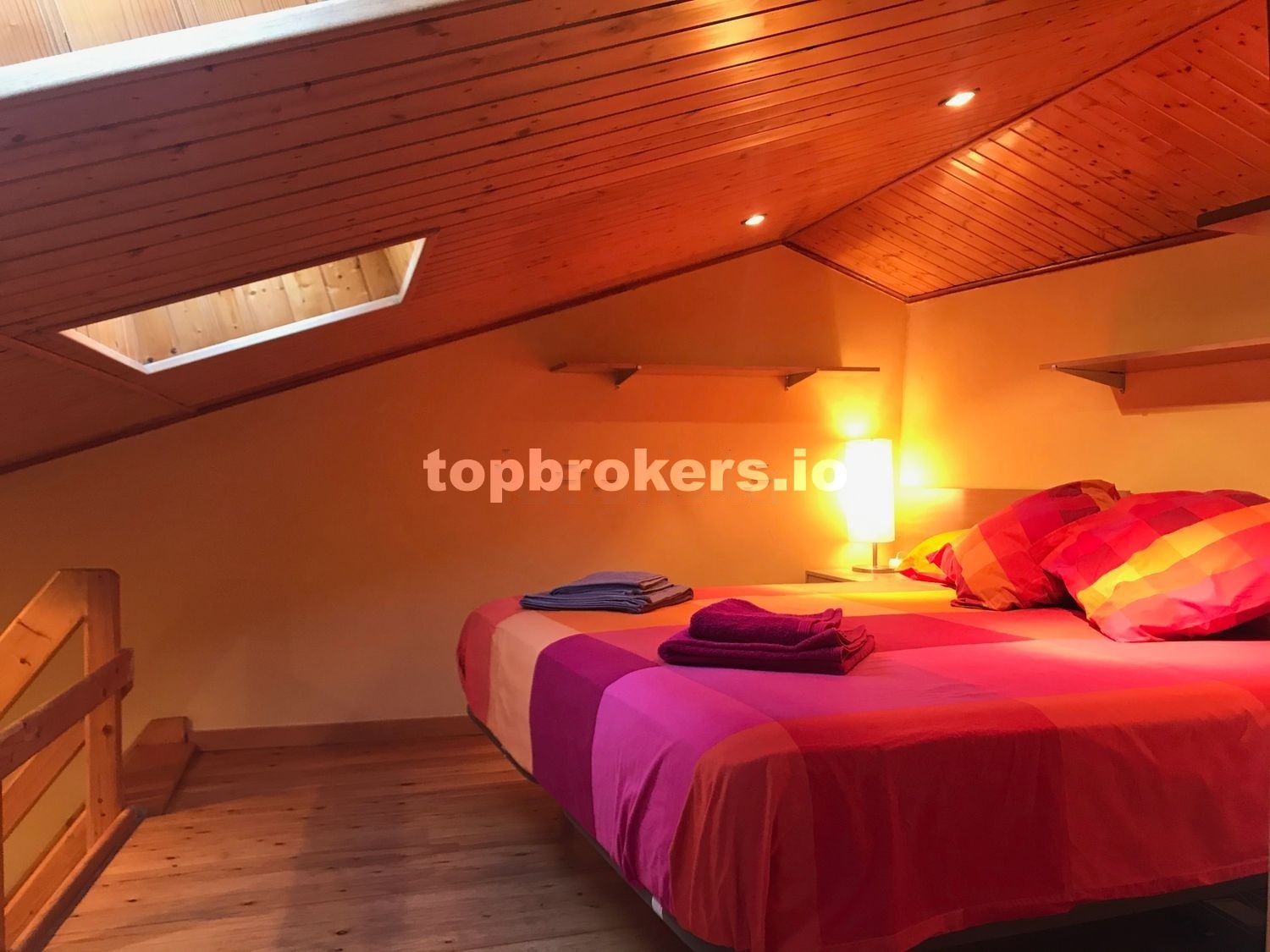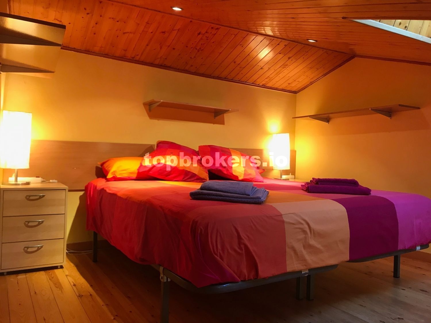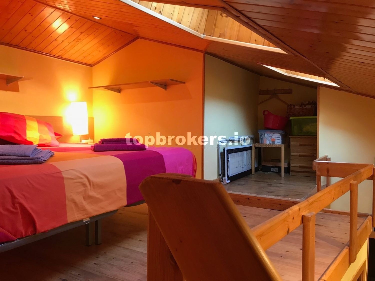 En la boardilla, tenemos la cama de matrimonio, de 1,80 x 2,00 m, 2 mesitas de noche con 3 cajones cada una.